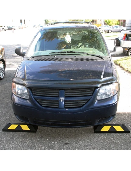 The garage stop prevents damage to personal belongings and interior walls by helping drivers stay within a designated parking spot. This black and safety yellow wheel stop is particularly useful for homeowners who store equipment or valuables inside their garage as well as novice and teen drivers. Made from 100 percent recycled rubber tires. Reflective yellow stripes provide maximum visibility. Installs without mounting hardware.