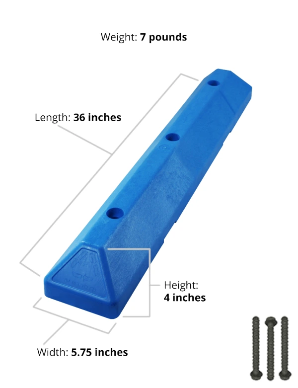 Engineered for added strength at lower weight, the 3-foot commercial plastic parking block can be carried and installed by a single person. LEED qualified and made from injection-molded, 100 percent recycled HDPE plastic, this parking stop resists tire scuffing and natural elements. The color is molded throughout – there's no upkeep required. Great for shopping mall parking lots, apartment and condo complexes, and commercial grounds. Has recessed bolt holes and mounting hardware is included.