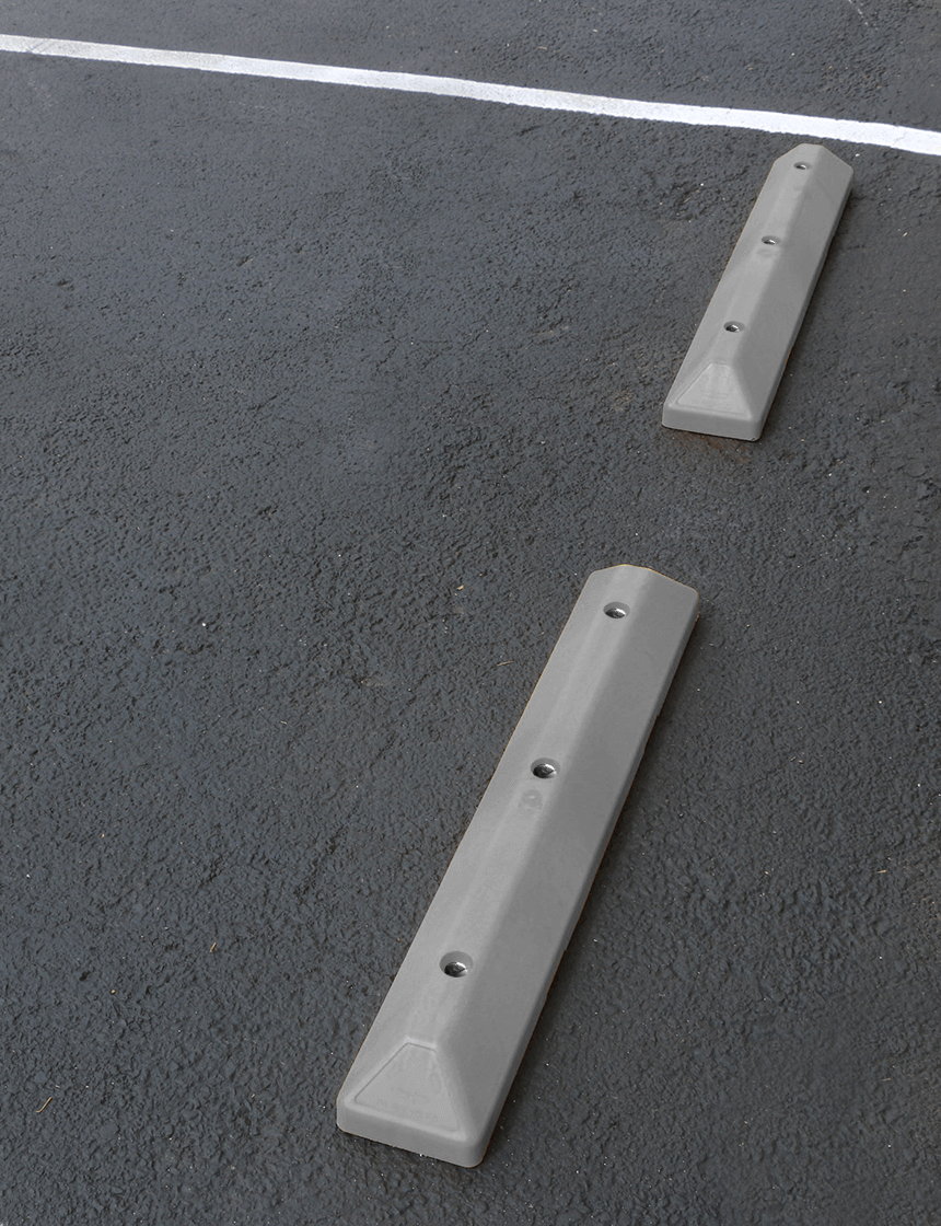 Engineered for added strength at lower weight, the 3-foot commercial plastic parking block can be carried and installed by a single person. LEED qualified and made from injection-molded, 100 percent recycled HDPE plastic, this parking stop resists tire scuffing and natural elements. The color is molded throughout – there's no upkeep required. Great for shopping mall parking lots, apartment and condo complexes, and commercial grounds. Has recessed bolt holes and mounting hardware is included.