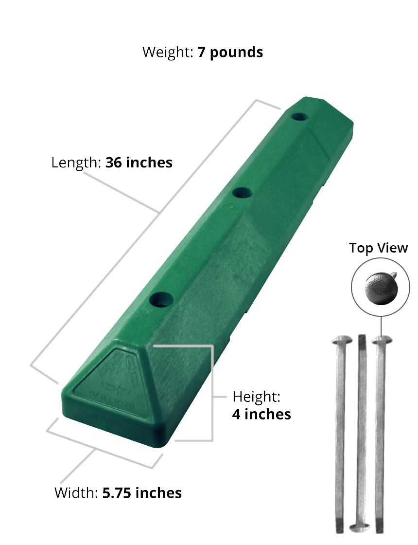 3' Green EV Recycled Plastic 'Commercial' Parking Block w/three 12" Galvanized Steel Spikes