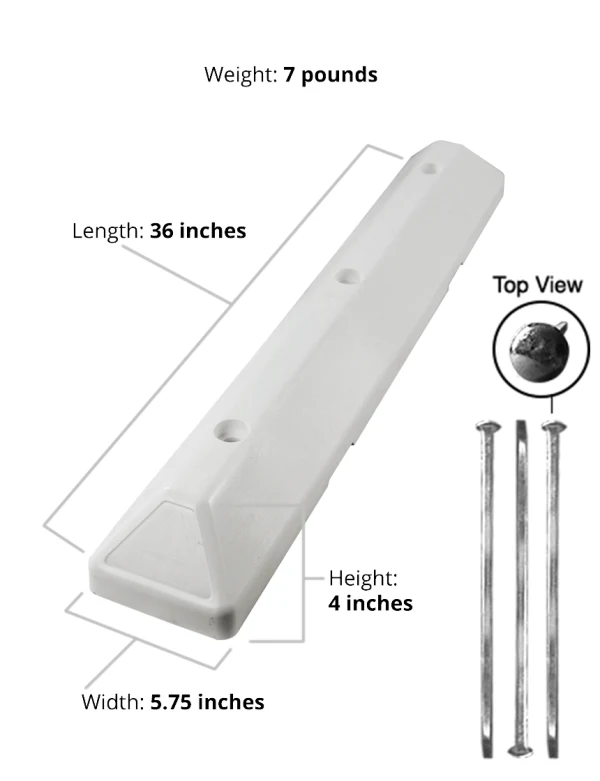 3' White Recycled Plastic 'Commercial' Parking Block w/three 18" Galvanized Steel Spikes