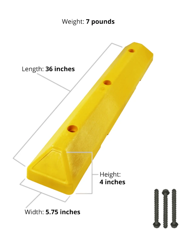 Engineered for added strength at lower weight, the 3-foot commercial plastic parking block can be carried and installed by a single person. LEED qualified and made from injection-molded, 100 percent recycled HDPE plastic, this parking stop resists tire scuffing and natural elements. The color is molded throughout – there's no upkeep required. Great for shopping mall parking lots, apartment and condo complexes, and commercial grounds. Has recessed bolt holes and mounting hardware is included.