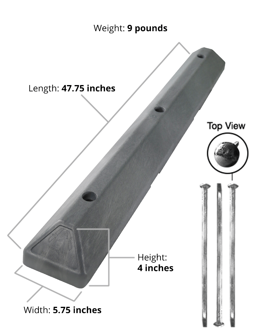 4' Gray Recycled Plastic 'Commercial' Parking Block w/three 18" Galvanized Steel Spikes
